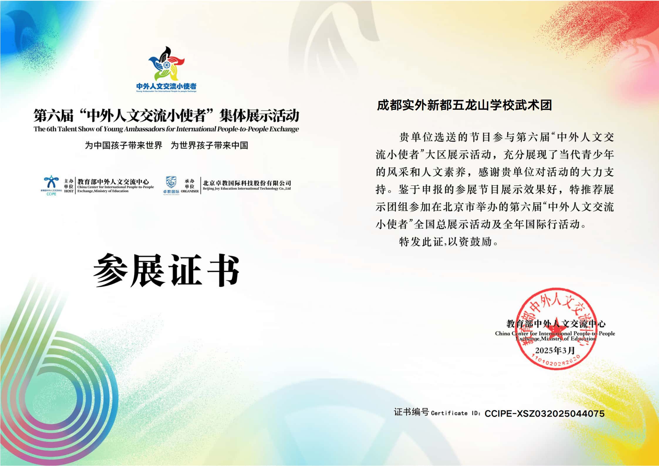 成都市第五屆小學生運動會武術項目一等獎第一名